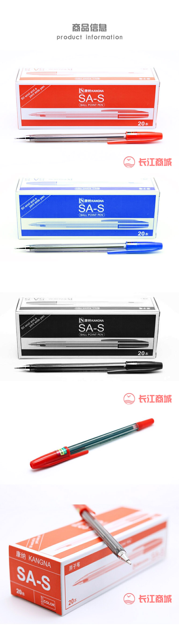 品牌:KANGNA/康纳 型号:SA-S 类别:圆珠笔 颜色:黑/蓝/红 规格:20支/盒 书写粗细:0.7mm