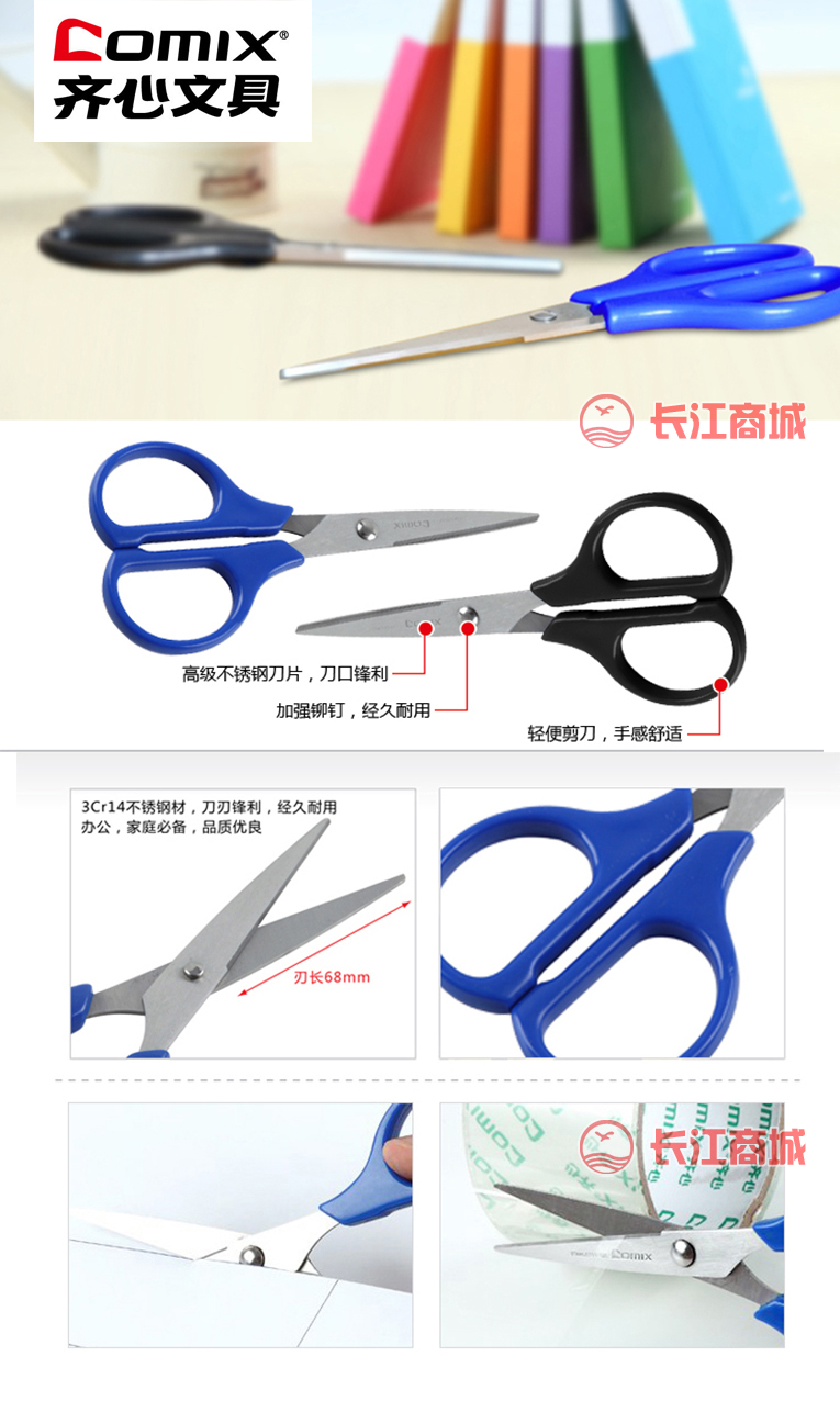 品牌:Comix/齐心 型号:B2714 类别:剪刀 颜色:黑色/蓝色(随机) 规格:147mm
