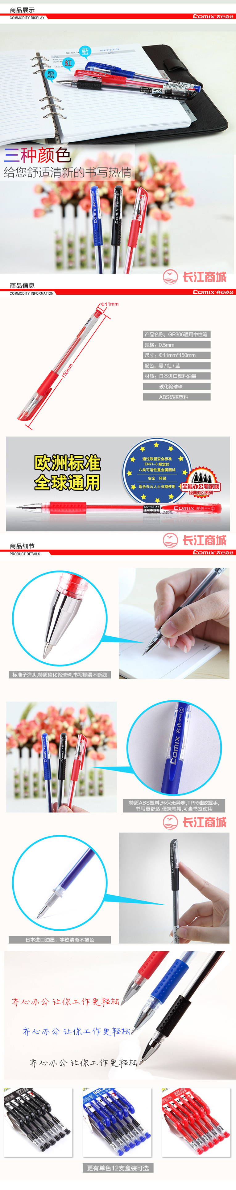 品牌:Comix/齐心 型号:GP306 类别:中性笔 书写粗细:0.5mm 颜色:黑/红/蓝 包装:12支/盒