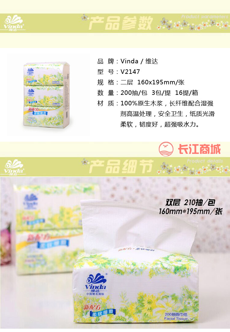 品牌:Vinda/维达 型号:V2147 品名:软抽面巾纸 规格:2层;160x195mm/张