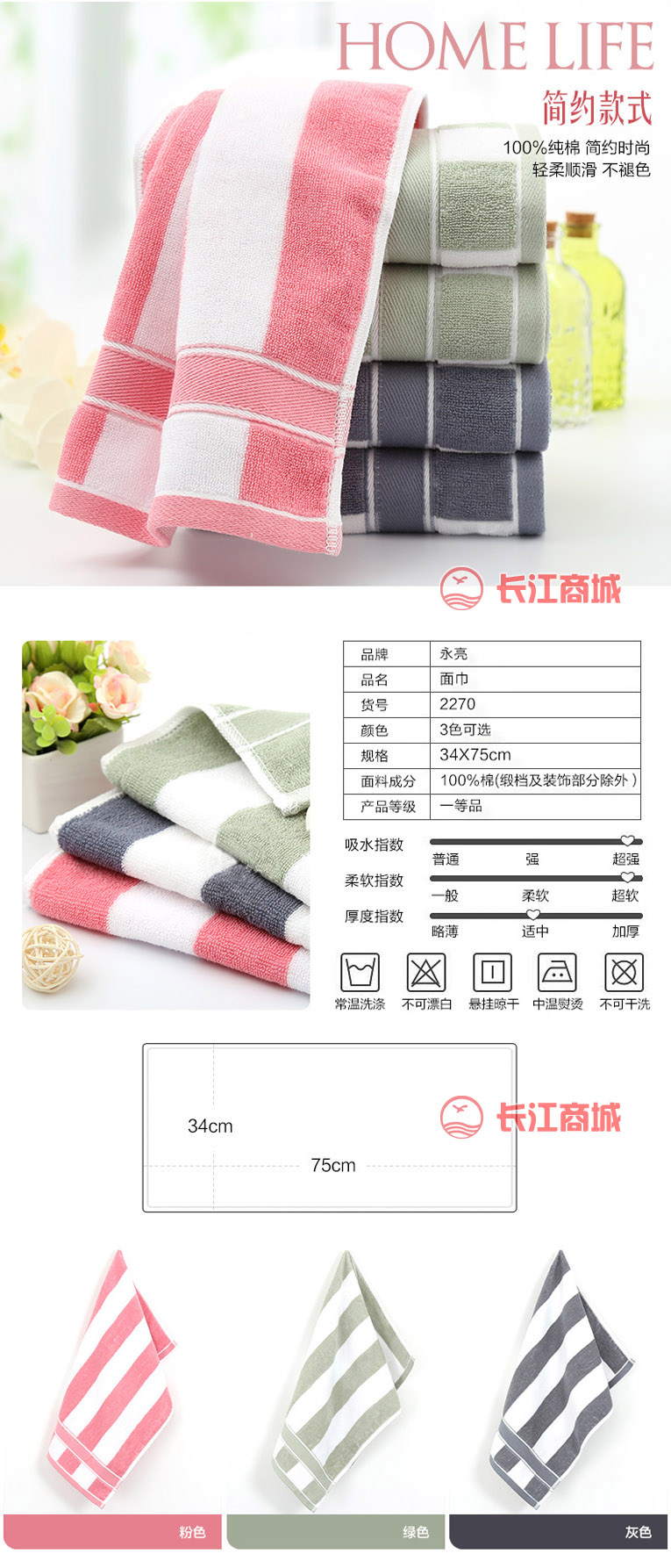品牌:永亮 型号2270 类别:面巾 颜色:粉红色/绿色/灰色(随机) 尺寸:34x75cm