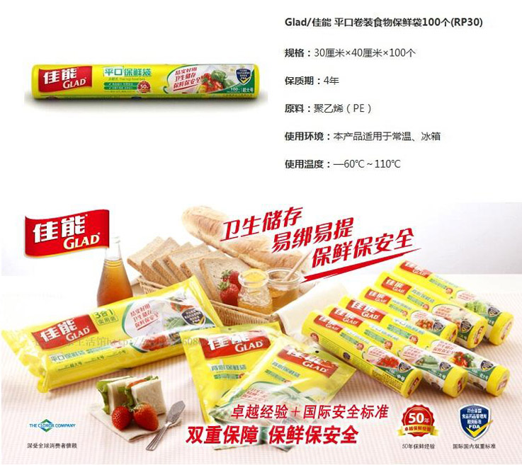 品牌:GLAD/佳能 型号:RP30 种类:点断式食物保鲜袋