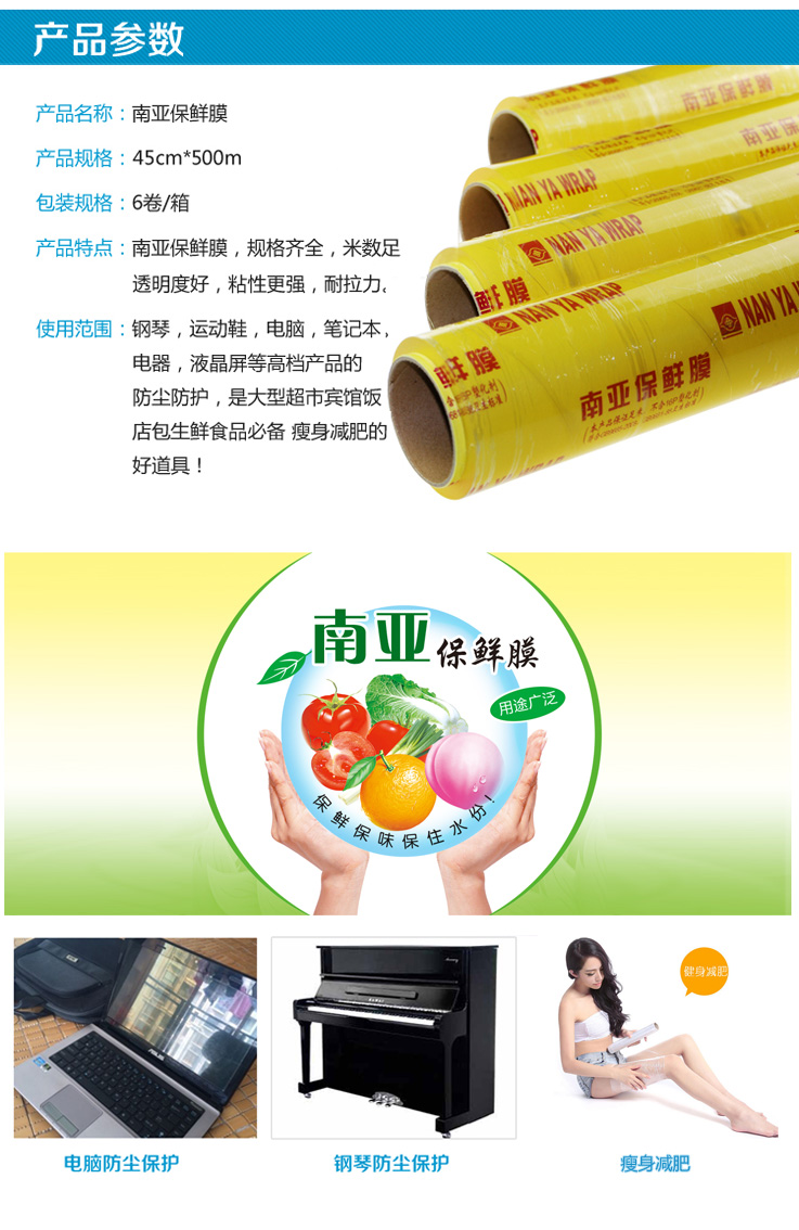 品牌: 南亚 品名:保鲜膜 尺寸: 45cmx500m 颜色: 透明白 包装种类: 简装 材质: PV