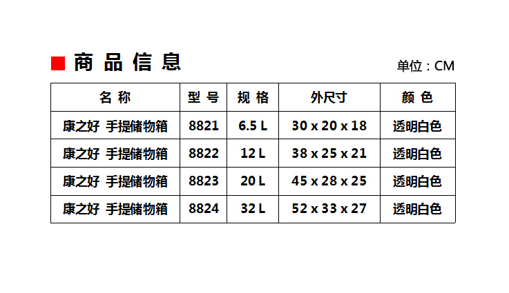 品牌:康之好 型号:8821/8822/8823/8824 类型:手提储物箱 材质:塑料