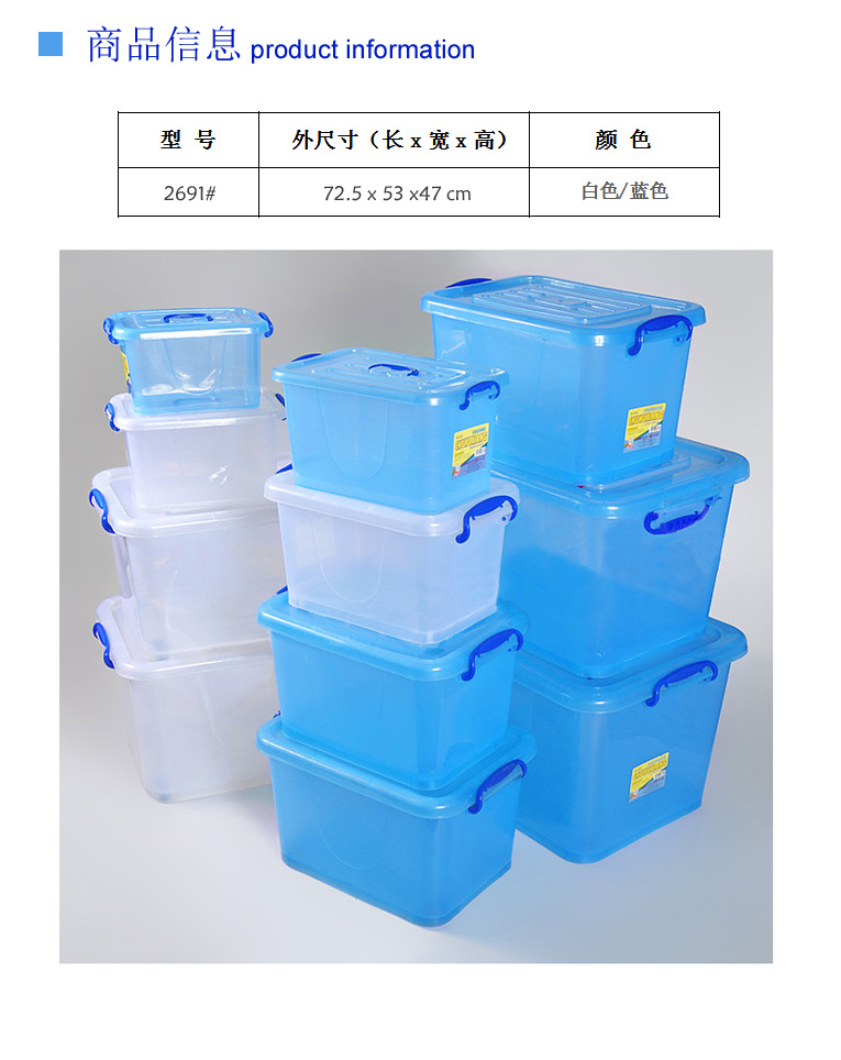 品牌:恒达 型号:2691 类型:储物箱/整理箱 材质:塑料 颜色:透明(白色/蓝色) 是否带滑轮:是
