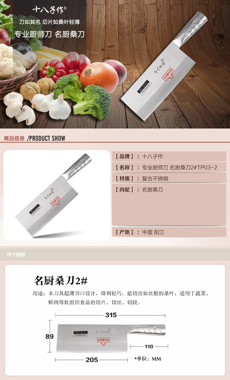 品牌:十八子作 货号: TP03-2 类型:切片刀、桑刀 材质: 复合不锈钢