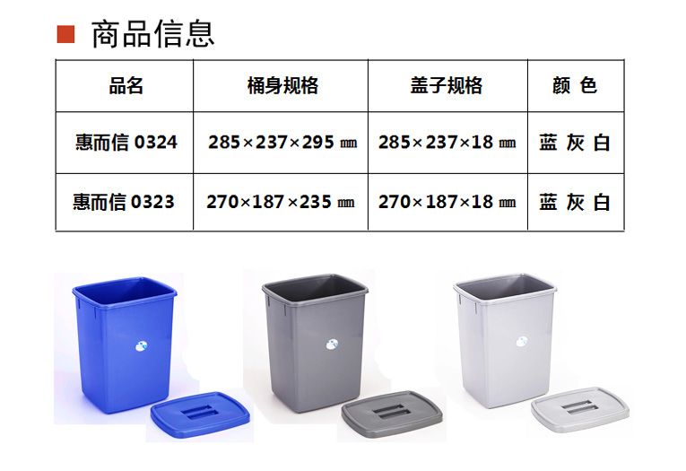 品牌:惠而信 型号:0324 类型:方形垃圾桶 是否带盖:是 颜色: 白色 蓝色 灰色