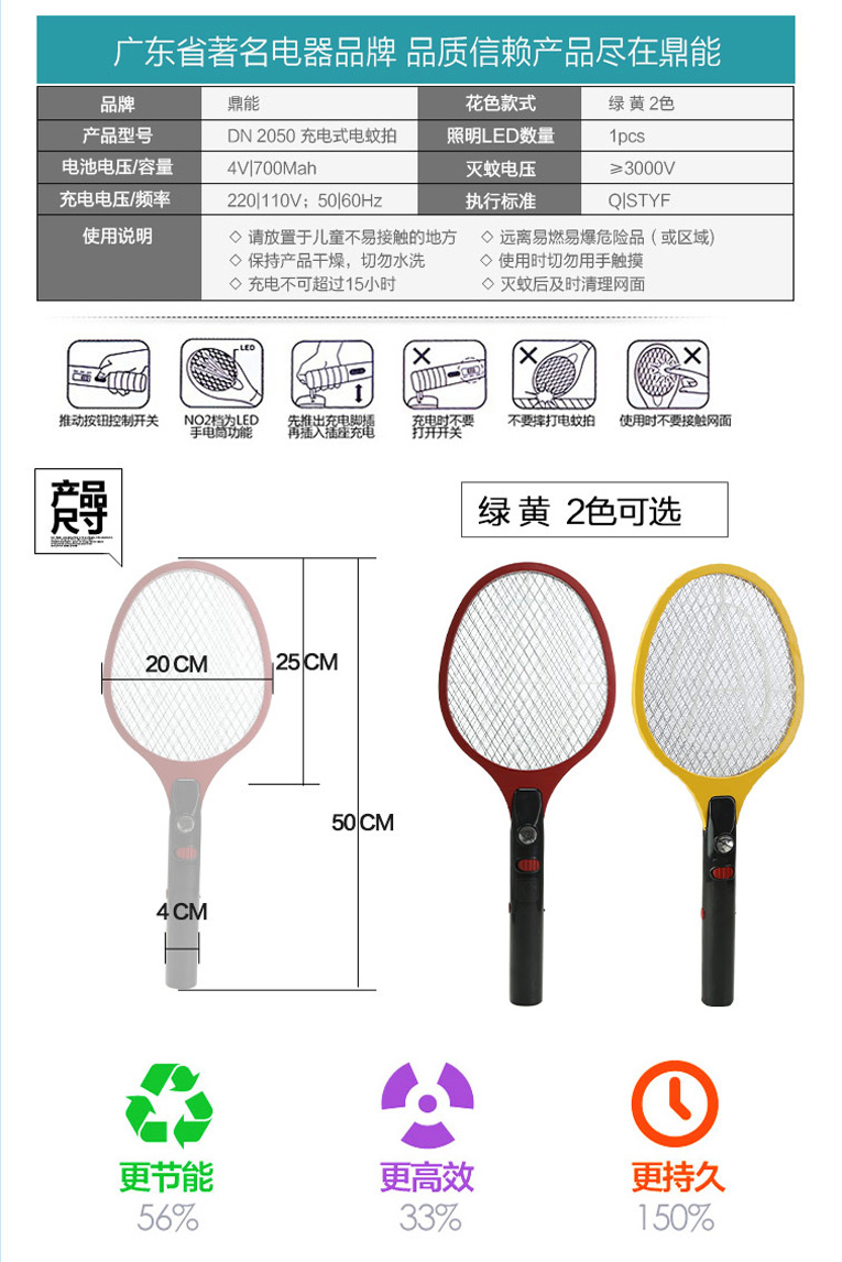 品牌:鼎能 分类:充电式电蚊拍 颜色:随机 灭蚊电压:330V 充电电压:110V ~ 220V