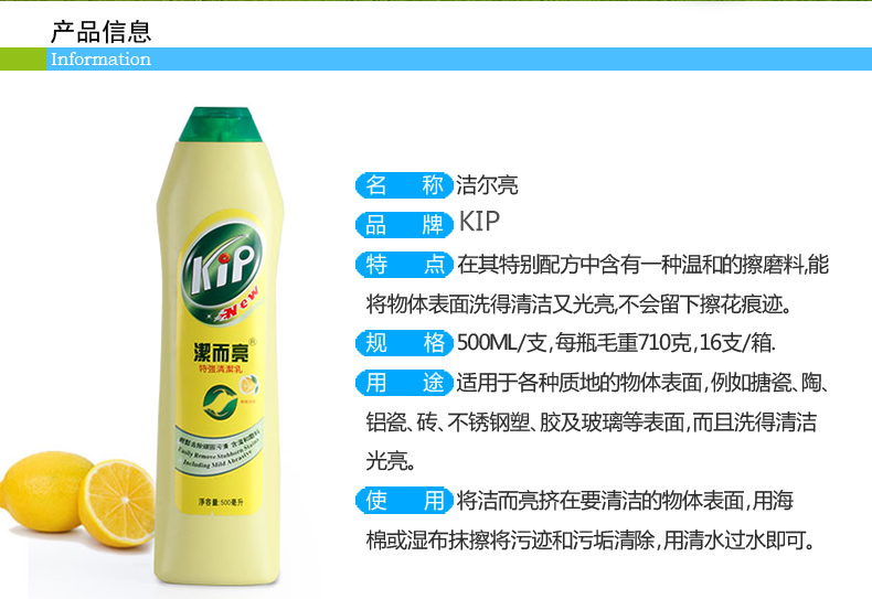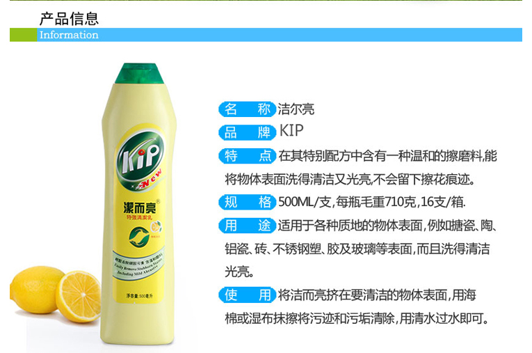 品牌:洁而亮 类型:去污液 适用空间:厨房 产品PH值: PH<7 净含量:500g 香味:柠檬香型