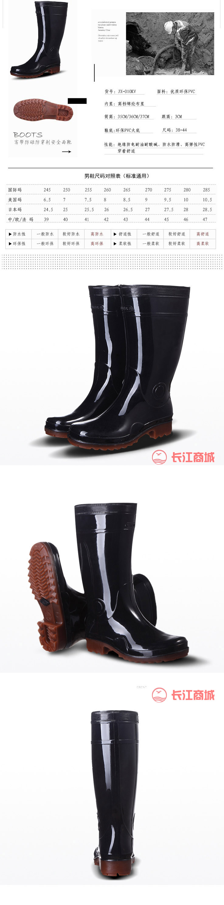 鞋底材质:PVC 鞋帮高度:中筒 颜色:黑色 尺码:40/41/42/43/44