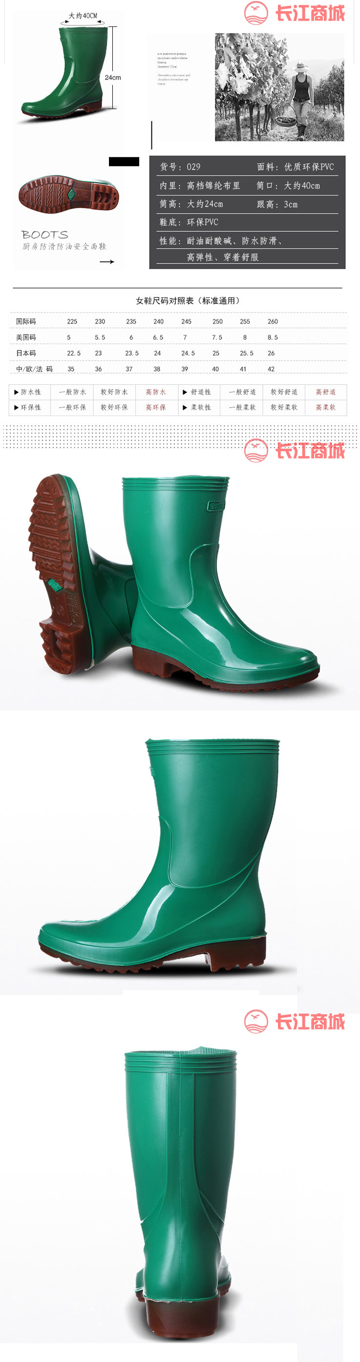 鞋底材质:PVC 鞋帮高度:中筒 颜色:绿色 尺码:37/38/39/40