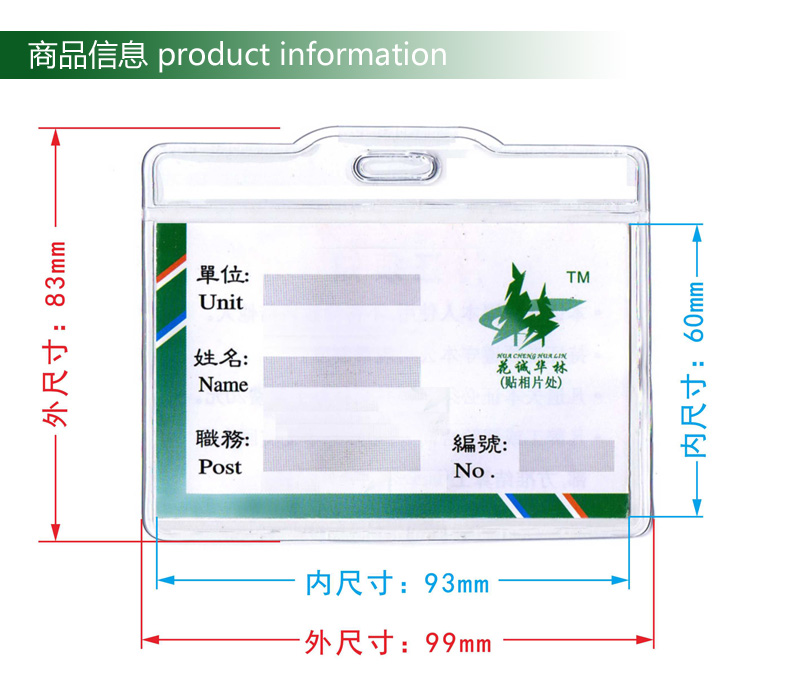 外尺寸:99 x 83 mm ; 内尺寸/可放胸卡尺寸:93 x 60 mm