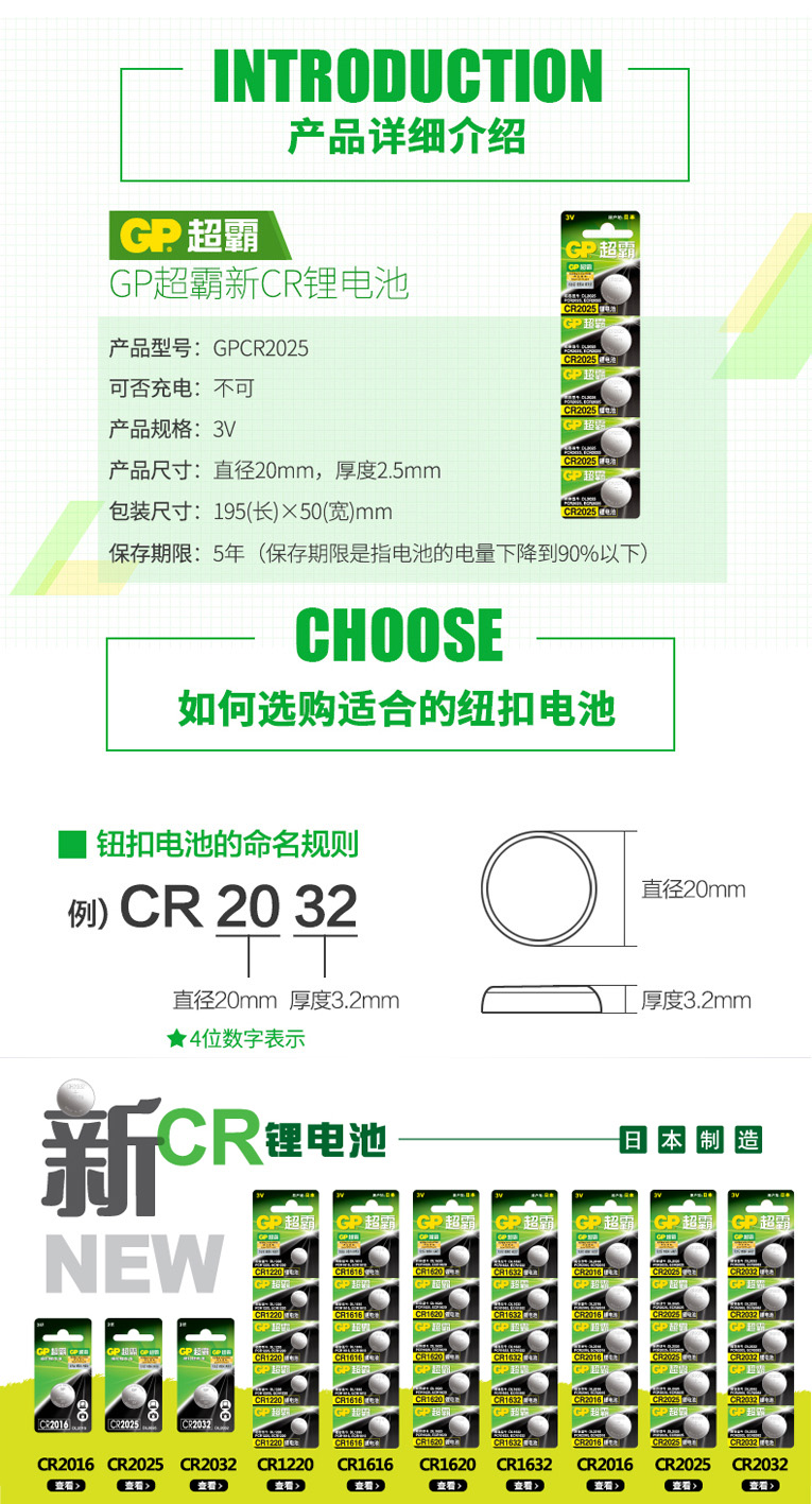 品牌:GP/超霸 型号:GPCR2025 类型:锂电池 规格:3V 可否充电:否 包装:5粒/排