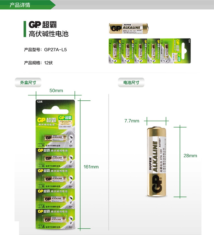 品牌:GP/超霸 型号: GP27A-L5 类型:高伏碱性电池 电压:12V 包装:5粒/卡