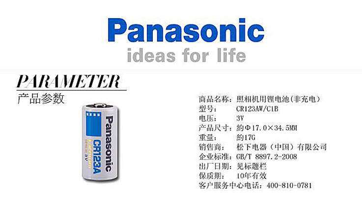 品牌:Panasonic/松下 型号:CR123A 类型:一次性锂电池 规格:3V 电池节数: 1节