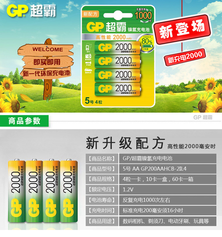 品牌:GP/超霸 型号:5号/GP200AAHCB-2IL4 类型:镍氢充电电池 包装:4粒/卡 电压:1.2V 、