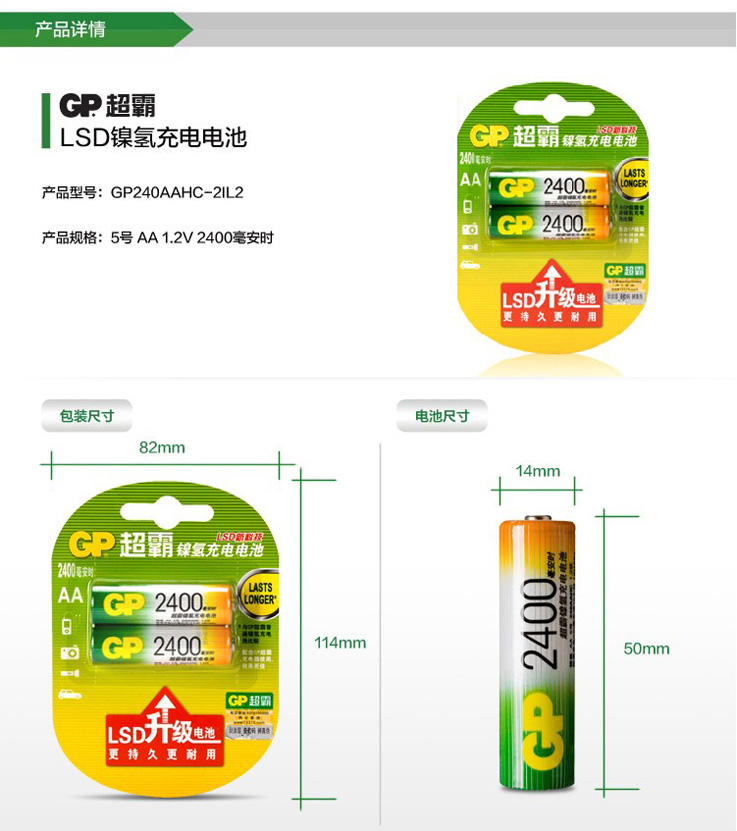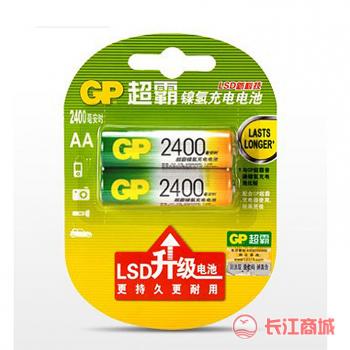 品牌: GP/超霸 电池规格:5号 型号:镍氢可充电电池 容量:2400mAh 规格:2节