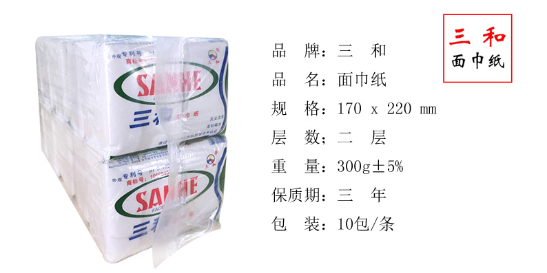 品牌:三和 品名:面巾纸 规格:170 x 220mm x 2层 重量:300g±5% 包装:10包/条