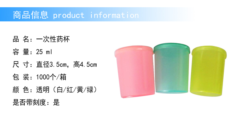 品名:一次性药杯 容量:25ml 尺寸:直径3.5cm,高4.5cm 包装:1000个/箱