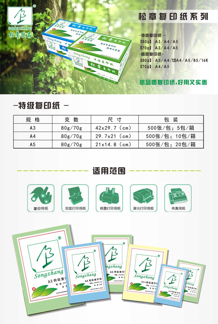 品牌:松章纸品 系列:特级复印纸 规格:A3/A4/A5 克数:80g/70g 包装:500张/包 颜色:白色