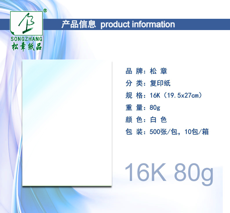 品牌:松章 品名:增白复印纸 规格:16K 重量:80g 颜色:白色 包装:500张/包,10包/箱