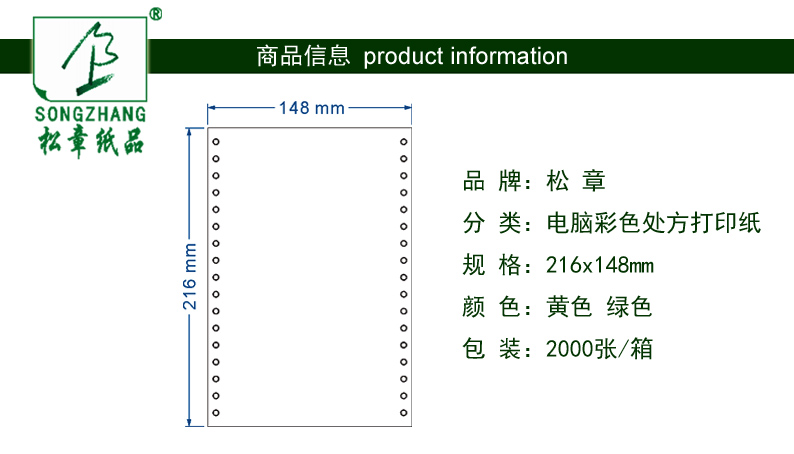 品牌:松章 品名:电脑处方纸 颜色:黄色/绿色 单位:箱 包装:2000张/箱